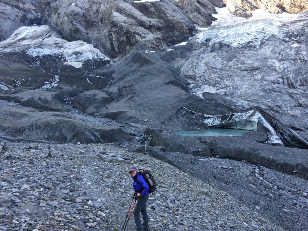 Au petit matin, nous reprenons le chemin pour une sublime descente sur la moraine du glacier Gamchigletscher. Le chemin est bien sécurisé et les passages de torrents et de gorges glaciaires s’effectuent sur de solides passerelles de bois ou de métal.