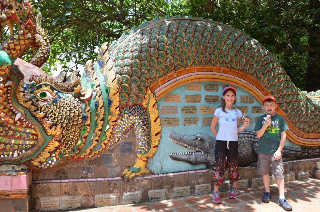 Enfin le meilleur pour la fin, le Wa Phra Doi Suthep perché sur le mont éponyme (1 676 m), dominant Chiang Mai. L’accès se mérite, puisqu’il faut gravir les 309 marches de son escalier monumental, accompagnés d’impressionnantes rampes en forme de serpent.