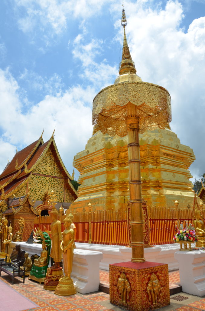 L’ensemble monastique, regroupant des édifices de plusieurs époques, est regroupé autour du chedî original construit à la fin du XIVe siècle, sous les ordres du roi Keu Naone. Le site est absolument éblouissant, marqué par un opulent revêtement d’or, notamment sur le chedî principal censé contenir la relique sacrée de Bouddha qui a contribué à la fondation du temple. De ses terrasses, le panorama sur Chiang Mai et la plaine est juste magnifique.