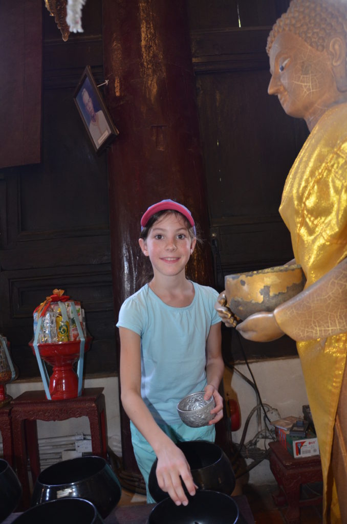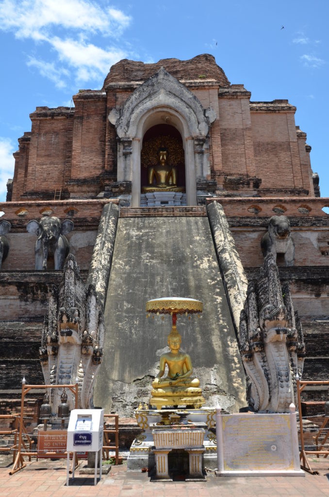 Enfin nous arrivons sur l’impressionnant site du Wat Chedi Luang. La visite commence par le grand viharn, un temple dont la décoration intérieure est éblouissante : de gigantesques colonnes peintes en noir et or soutiennent un toit rouge élevé sur trois niveaux. Puis nous effectuons le tour de l’imposante construction en pierre, haute de 85 mètres, ornées de sculptures d’éléphants. Ce chedî (reliquaire en forme de cloche contenant parfois des reliques de Bouddha) datant du XVe siècle, a été partiellement rénové dans les années 90. Dans chaque temple ou à proximité, nous remarquons souvent un coffre-fort mis à disposition pour recevoir les offrandes en espèces. La taille du coffre dépend de la notoriété du temple, afin de recevoir des offrandes plus ou moins conséquentes ! Aussi dans ces lieux, des sessions de conversation avec des moines (habituellement des novices) sont proposées chaque jour, afin d’échanger avec eux sur le Bouddhisme ou la Thaïlande.