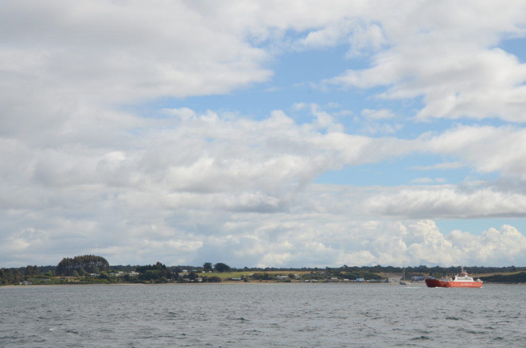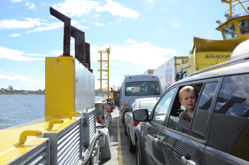 Jour 1 | Puerto Varas > Castro : nous laissons derrière nous les Andes (voir l’article Lacs et volcan andins, entre Chili et Argentine) afin d’embarquer sur le ferry à Pargua pour accomplir la traversée relativement courte (30 mn) et plaisante du canal de Chacao, séparant l’île de Chiloé du continent. Un pont suspendu long de 2 km est en cours de construction, mais après de multiples rebondissements et arrêts du chantier, l’ouvrage ne sera pas achevé avant 2023…