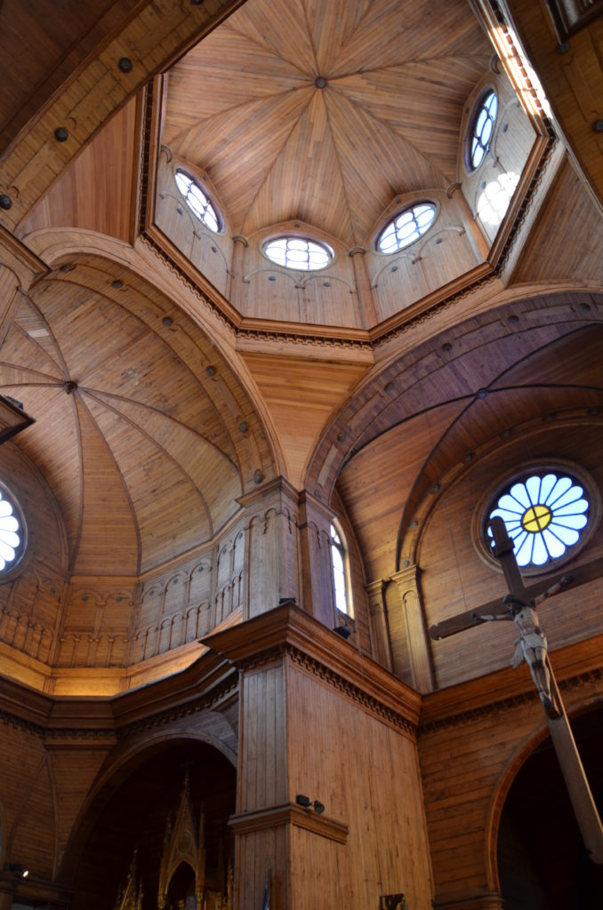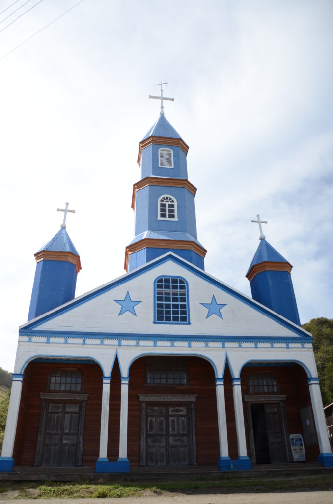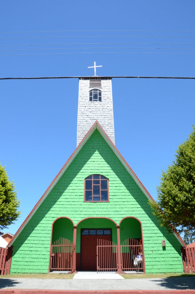 Jour 3 | Qinchao : nous consacrons cette journée aux fameuses églises qui font la réputation architecturale de l’archipel. Érigées au cours du XVIIe siècle pour servir l’évangélisation du Nouveau Monde, les missionnaires espagnols ont dû composer avec le savoir-faire indigène pour bâtir ces églises. La plupart a été construite intégralement en bois, à partir de techniques utilisées par les pêcheurs Huilliches pour la construction de leurs bateaux. Parmi les 60 églises encore debout, 16 d’entre elles sont déclarées au Patrimoine culturel mondial de l’UNESCO, formant ainsi la « Route des églises de Chiloé ». Impossible de toutes les visiter, il faudra alors faire une sélection. Nous embarquons sur le traversier à Dalcahue pour nous rendre sur l’ile voisine de Quinchao qui abrite quelques églises classées de Chiloé. Nous effectuons une première étape dans le petit village de Curaco de Velez regroupé autour d’une charmante place et d’une curieuse église verte. De belles demeures bourgeoises sont dispersées dans le village, dont les façades composées de petites plaques de bois ne sont pas sans rappeler les écailles de poisson. Tout près de la place, une petite feria artisanal présente un artisanat chilote de qualité (et notamment de superbes couvertures en laine).