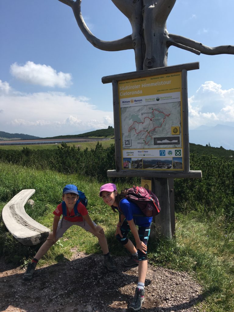 Le haut-plateau alpin de Renon/Ritten s’étend autour des 2000m, offrant un magnifique terrain de jeu estival que l’on découvre grâce à un vaste réseau de sentiers bien balisés. Nous empruntons le train historique de Renon pour nous rendre à Klobenstein puis aux remontées mécaniques de Cornod el Renon. Arrivés à 2070 m, il nous reste peu de dénivelé à accomplir sur un sentier panoramique qui offre une superbe vue sur l’Ouest des Dolomites. Nous contournons le sommet par le chemin Südtiroler Himmelstour et accédons ainsi au Rittner Horn par le versant Nord. A 2260 m, la vue est toujours aussi spectaculaire mais il vente à décorner les bœufs ! Nous nous abritons au refuge et nous réchauffons autour d’un succulent plat de pâtes Aldente. Nous redescendons par un large chemin empierré qui nous ramène directement à la gare supérieure des remontées mécaniques. Arrivés au Wanderhotel Régina, la piscine à débordement nous accueille pour relaxer de cette belle randonnée !