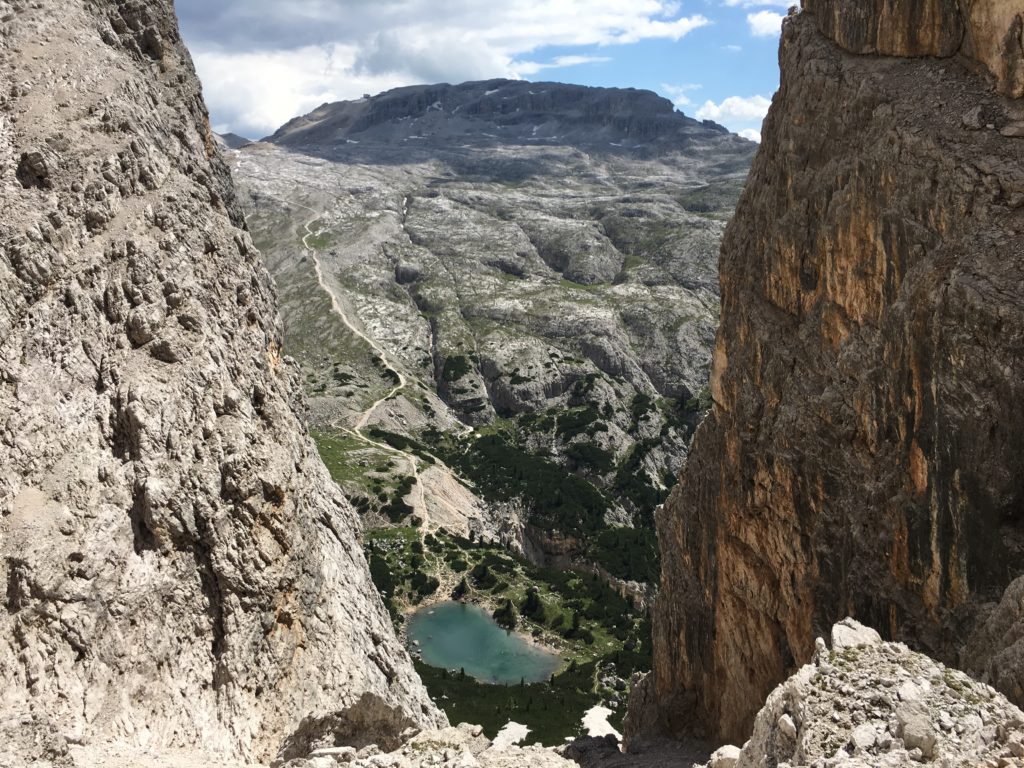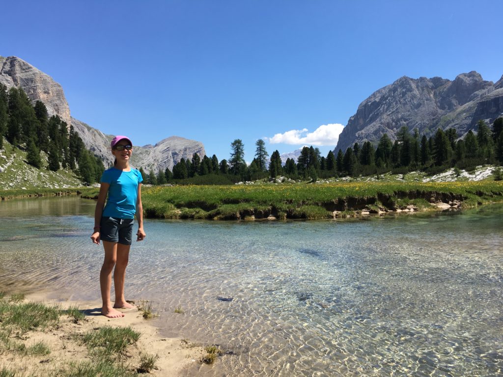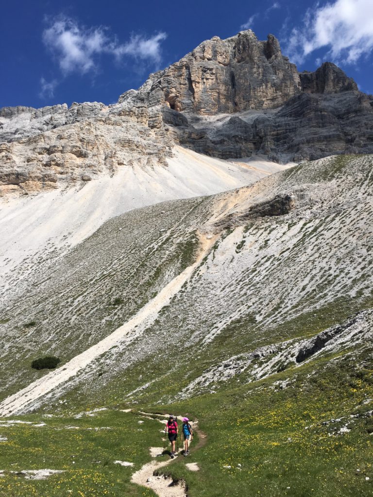 Dès 8h30, il y a déjà foule au parking de la Capanna Alpina, point de départ d’une randonnée dans le parc naturel Fanes-Sennes-Prags. Les Dolomites ne comptent pas moins de sept parcs naturels et un parc national, considérablement fréquentés par des randonneurs du monde entier, surtout en ce début de saison. Le sentier monte progressivement au Col de Locia pour déboucher sur un vaste haut plateau à 2000 m d’altitude. Nous traversons une zone d’alpage verdoyante, accompagnés par des vaches et des chevaux sauvages, pour rejoindre le refuge de Fanes. Nous pique-niquons au bord de la rivière où se reflètent les sommets environnants. Puis nous revenons sur nos pas et amorçons une longue ascension jusqu’au Forcella del Lago, sans savoir ce qui nous attendait derrière… de l’autre côté de ce col étroit, c’est un véritable mur qui redescend abruptement vers le lac Lagazuoi. Le sentier, tout en lacets, est tracé dans une pente extrêmement raide qui surplombe le lac cristallin. Nous rejoignons finalement notre point de départ en suivant une longue descente à travers les sapins, subjugués par la beauté des Dolomites.