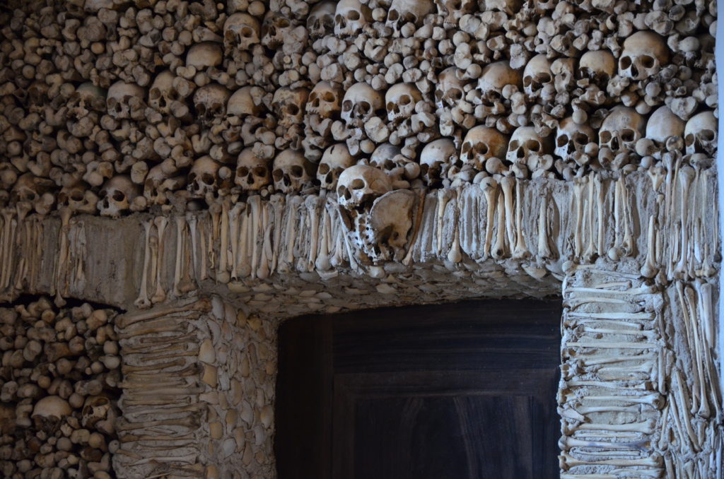 Évora est un véritable musée à ciel ouvert, possédant d’innombrables églises et autres monuments, témoignages de son passé riche et mouvementé. Nous arrivons justement devant l’Igreja de São Francisco, le site le plus visité de la ville. On y vient certes pour contempler son architecture gothique et baroque, mais surtout la fameuse Capela dos ossos, la chapelle des ossements. Construite au 17e s., les murs et les piliers sont recouverts de milliers d’os et de crânes humains provenant de sépultures voisines… Une façon de provoquer une réflexion sur le caractère éphémère de la vie humaine. Plutôt spectaculaire même si le lieu nous glace… les os ! A nouveau, nous pouvons grimper sur les toits de l’église qui révèlent une belle vue sur Évora, et permet de reprendre ses esprits après cette visite pour le moins surprenante.
