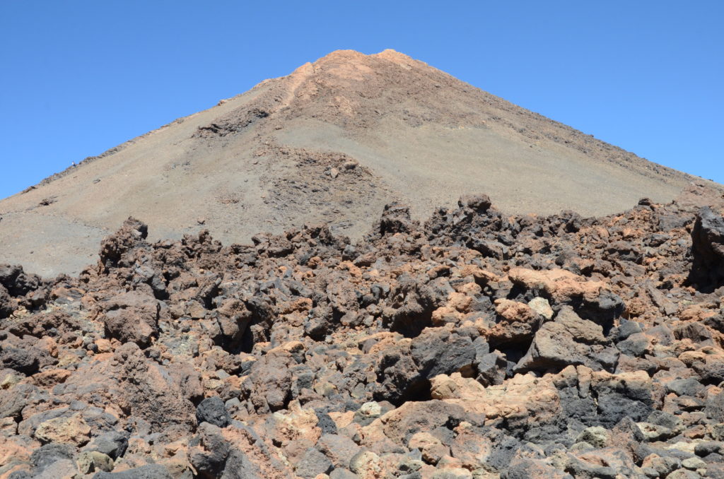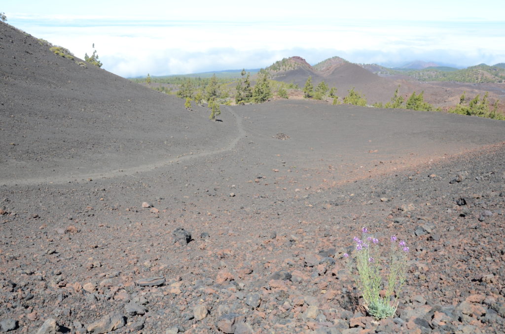 Puis nous partons dans la direction opposée pour rejoindre le Mirador del Pico Viejo (itinéraire no12) qui offre un impressionnant panorama sur la partie sud du parc et le cratère Pico Viejo. Nous redescendons en téléphérique pour acheter des sandwichs à la cafétéria (de qualité moyenne, mieux vaut prévoir son propre pique-nique…) et partons nous installer en face de la station de téléphérique pour contempler le Teide sous un autre angle. Dans cet environnement exclusivement minéral, la végétation est rare et peut révéler des formes surprenantes.
