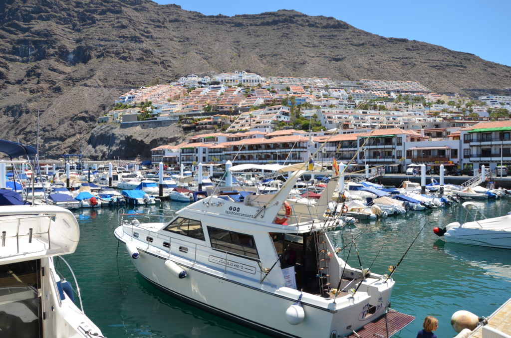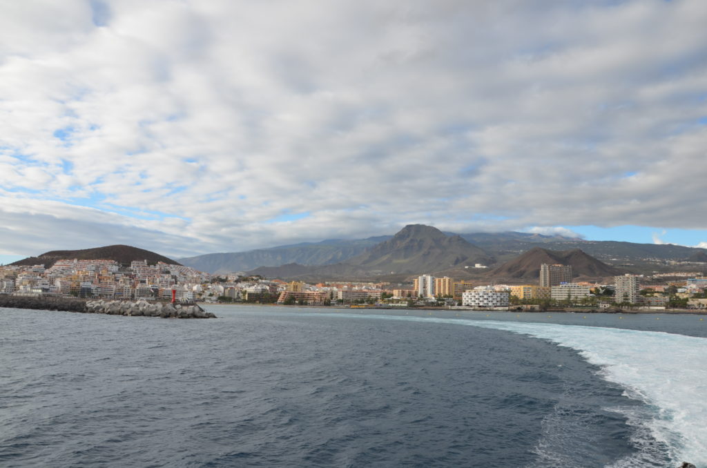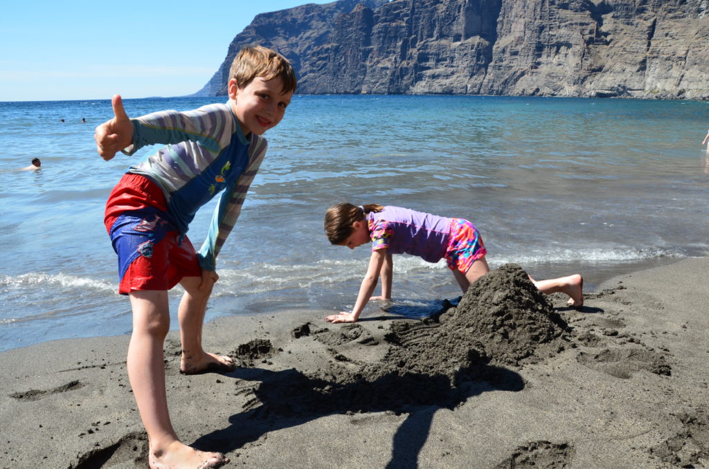 Puis nous prenons la direction de Los Gigantes, une station balnéaire récente qui porte le nom des imposantes falaises qu’elle côtoie. Nous déjeunons sur le port dans un super resto, le KV bar gourmet, tenus par de sympathiques belges. L’objet de notre visite ici est une croisière avec la compagnie Dolphin and Whale Watch. Nous embarquons à bord du voilier Katrine pour une croisière de deux heures. En quittant le port, nous pouvons admirer les falaises bien nommées Los Gigantes avant de prendre le large à la rencontre des dauphins et autres baleines. Nous retrouvons aussi la silhouette majestueuse du Teide qui domine l’ile tout entière. La journée se termine sur la petite plage située derrière le port, à l’abri des vagues, par une séance de construction de châteaux de sable volcanique…