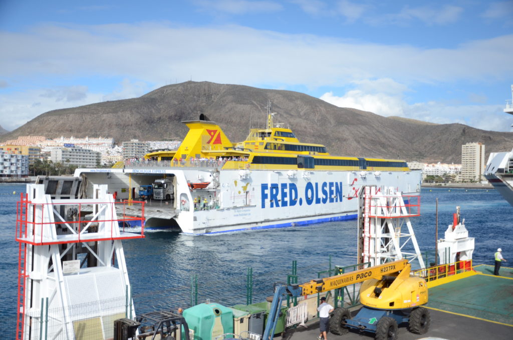 C’est en arrivant au sud de l’île que nous retrouvons le soleil. En fait, la chaîne montagneuse du Teide est une frontière naturelle entre 2 microclimats : au nord, il se caractérise par quelques variations de température et des pluies peu abondantes mais régulières, et au sud, un temps très sec et qui ne reçoit que de très rares précipitations, bloquées par le volcan. L’île est comme coupée en deux, et ce n’est donc pas un hasard si c’est au sud que se sont développées les infrastructures touristiques. Nous faisons une première étape à El Medano, une station balnéaire plutôt tranquille avec sa belle promenade en bois, ses nombreux petits cafés et restaurants, touristique mais pas trop. Ça se gâte lorsque nous approchons de Los Cristianos où nous allons prendre le ferry. Notre curiosité nous pousse à faire un rapide détour par Playa de las Américas… longue enfilade de restos pseudo branchés et de boutiques clinquantes, nombreux touristes allemands, anglais, russes qui supportent mal le soleil, bref un lieu qui ne présente guère d’intérêt pour nous si ce n’est les pintes de bière à 1€ ! Après un léger apéro/dîner à la cafétéria du port, nous embarquons sur le ferry de la compagnie Fred Olsen en direction de La Palma. Après 2 heures de navigation sur une mer d’huile, nous débarquons à la tombée de la nuit pour nous rendre à l’Hôtel San Telmo.