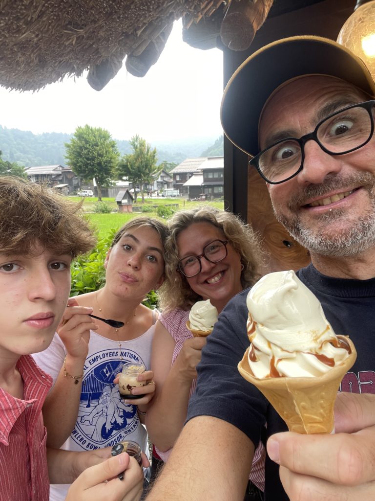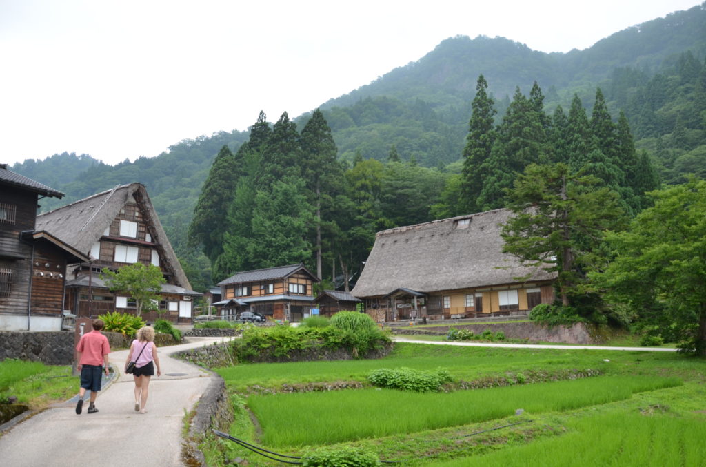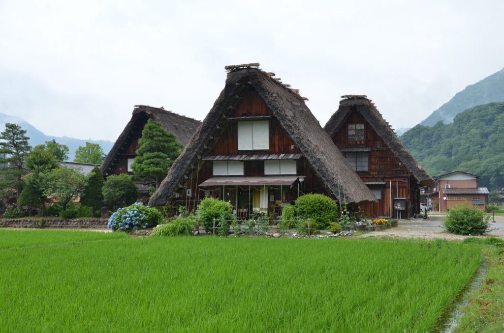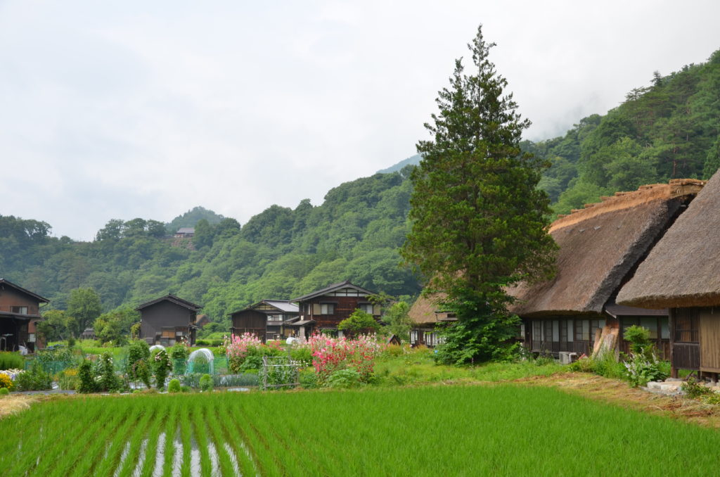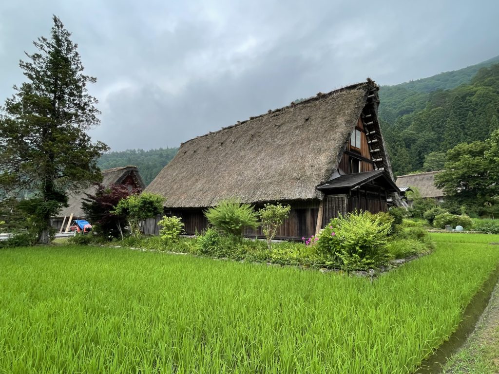 Changement d’ambiance pour notre seconde étape à Shirakawa-gō. Il y a foule dans ce village aux allures de carte postale. Après avoir stationné notre automobile sur l’un des parkings en périphérie du village, nous dégustons une succulente glace au matcha chez Purin-ni-ie avant de vadrouiller parmi les maisons traditionnelles posées au milieu de rizières verdoyantes.