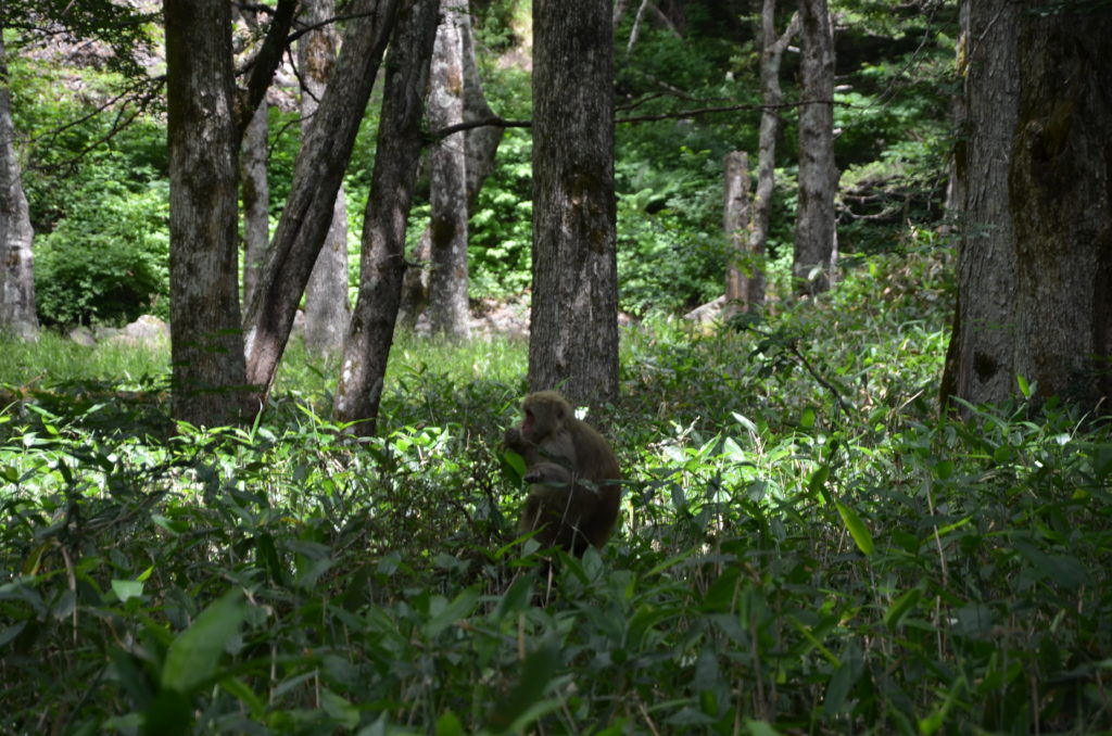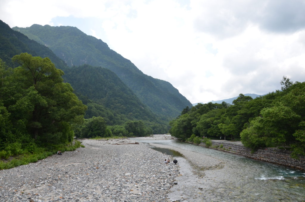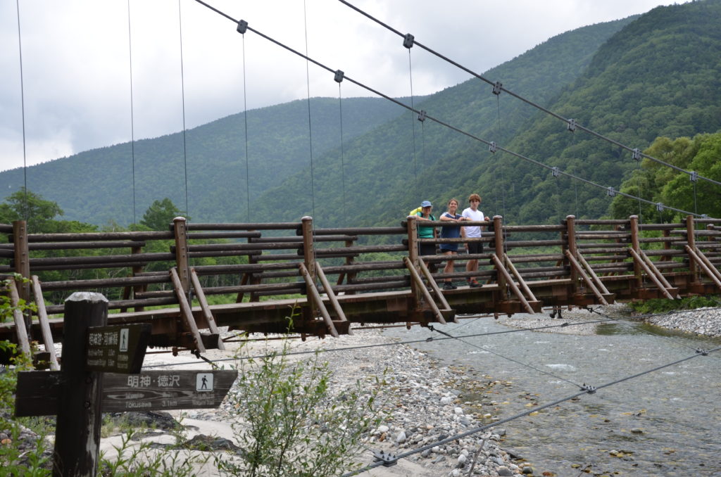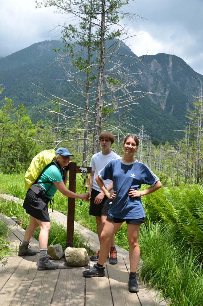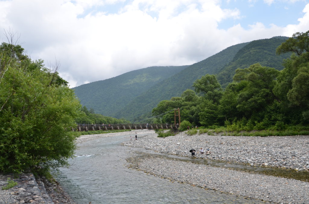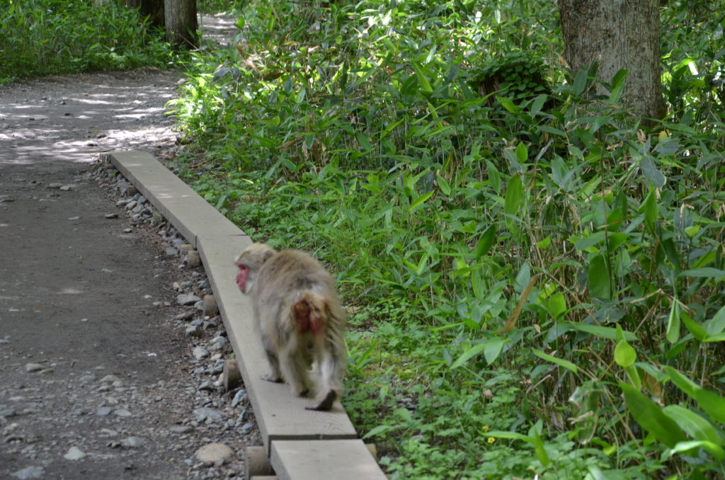 La partie en amont est un peu plus sauvage. Un sentier chemine au milieu d’une zone humide créé par les méandres de la rivière cristalline Azusa. Régulièrement, des Bear Bell émaillent le parcours mais nous supposons qu’elles sont plus installées pour amuser les touristes que pour effrayer les ours. Malgré la fréquentation touristique, nous rencontrons une colonie de petits singes, finalement peut préoccupés par notre présence. Nous terminons notre tour en traversant le camping du site puis atteignons le pont Kappa-bashi, point central qui offre une vue dégagée sur les montagnes environnantes. Nous regagnons le terminal de bus, dont la dimension doit être à la hauteur de la surfréquentation estivale. Avec cette chaleur, nous terminons la journée à l’onsen Hirayu no Mori avant de rentrer à Hida.