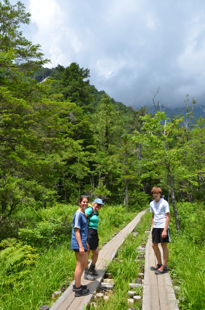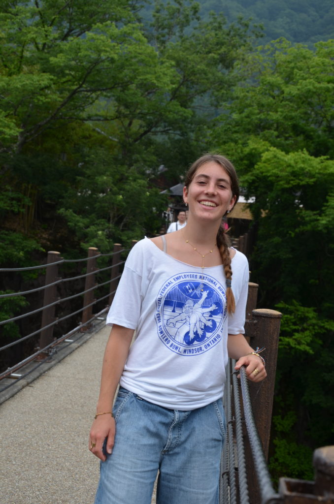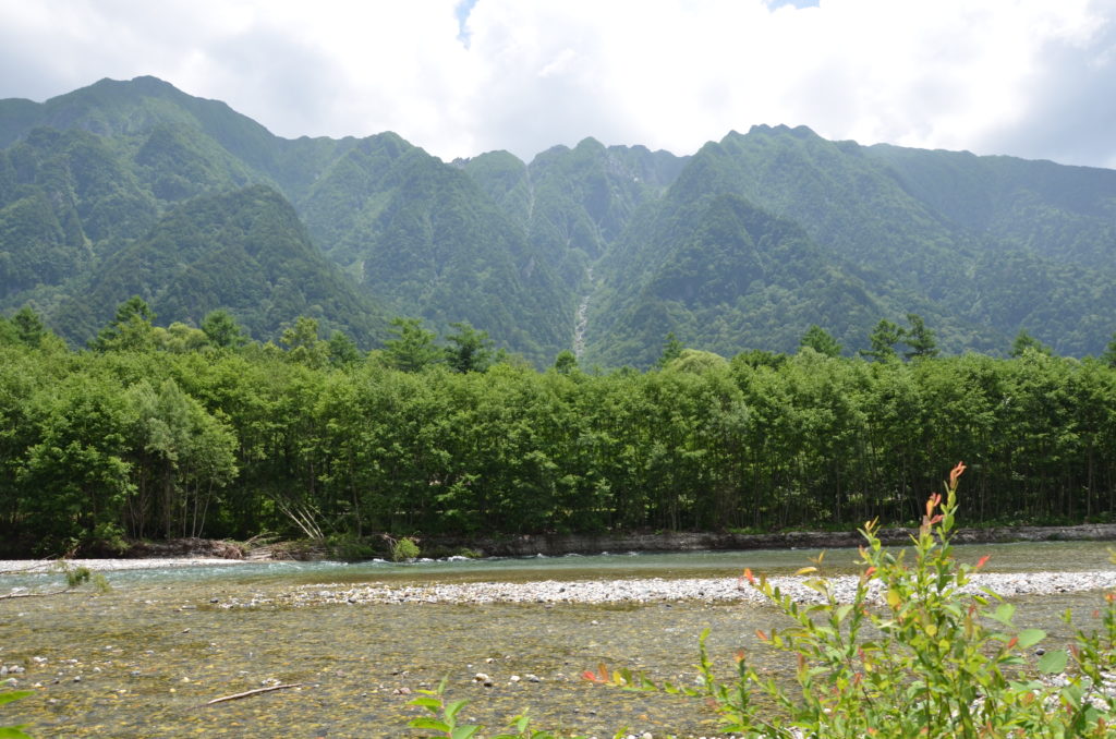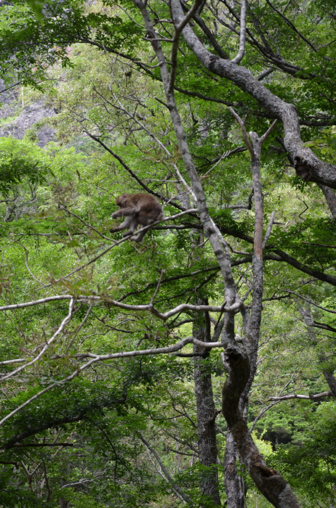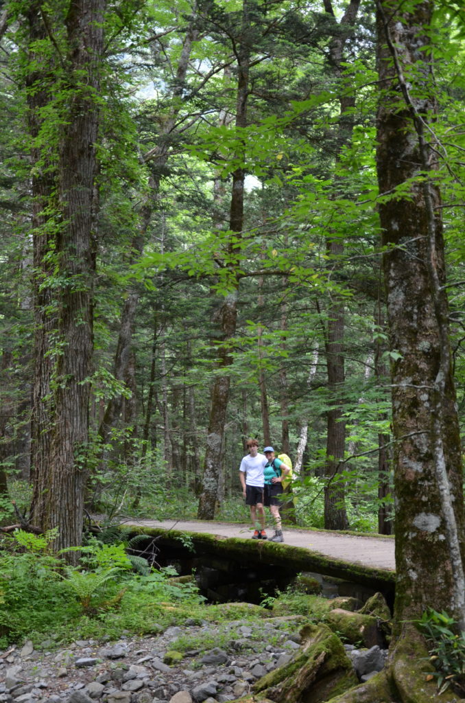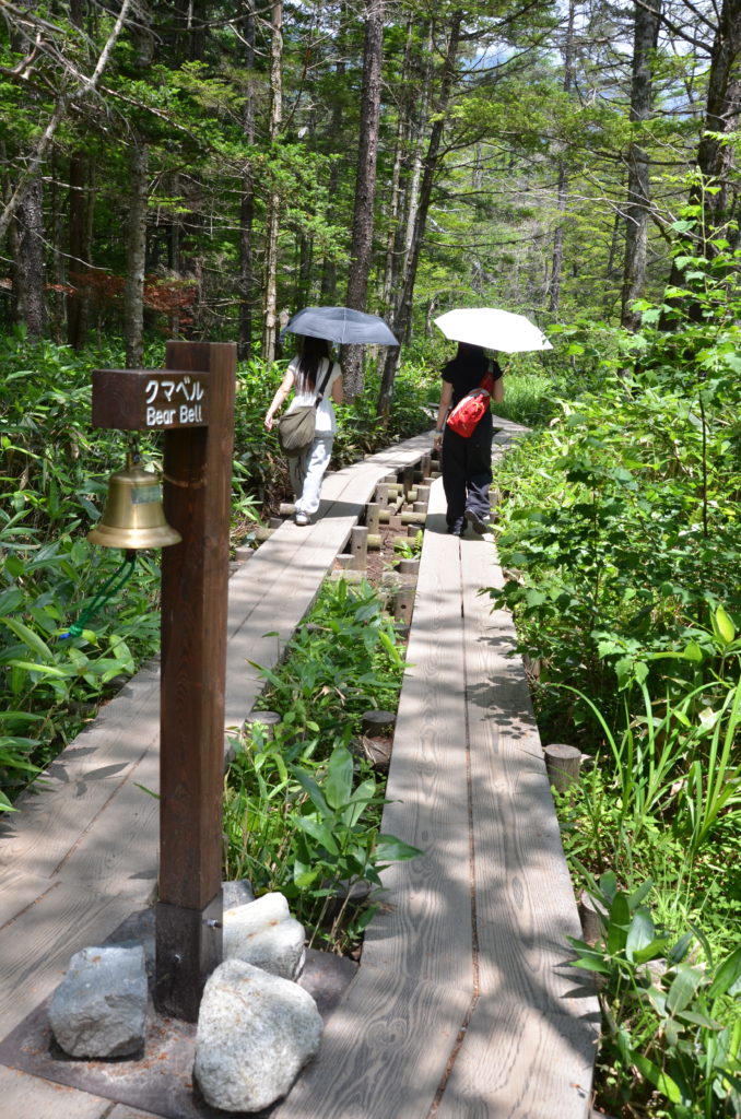La partie en amont est un peu plus sauvage. Un sentier chemine au milieu d’une zone humide créé par les méandres de la rivière cristalline Azusa. Régulièrement, des Bear Bell émaillent le parcours mais nous supposons qu’elles sont plus installées pour amuser les touristes que pour effrayer les ours. Malgré la fréquentation touristique, nous rencontrons une colonie de petits singes, finalement peut préoccupés par notre présence. Nous terminons notre tour en traversant le camping du site puis atteignons le pont Kappa-bashi, point central qui offre une vue dégagée sur les montagnes environnantes. Nous regagnons le terminal de bus, dont la dimension doit être à la hauteur de la surfréquentation estivale. Avec cette chaleur, nous terminons la journée à l’onsen Hirayu no Mori avant de rentrer à Hida.