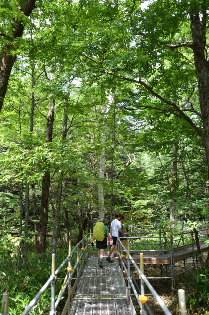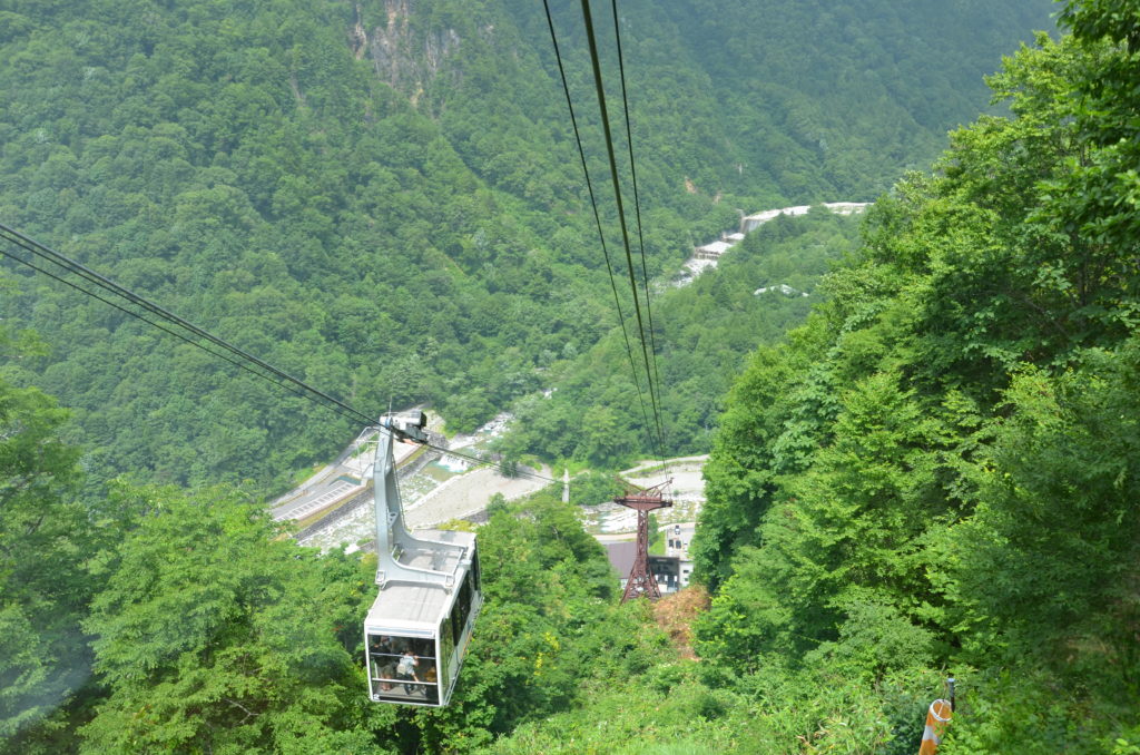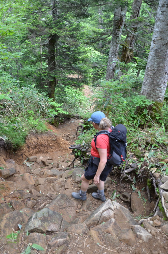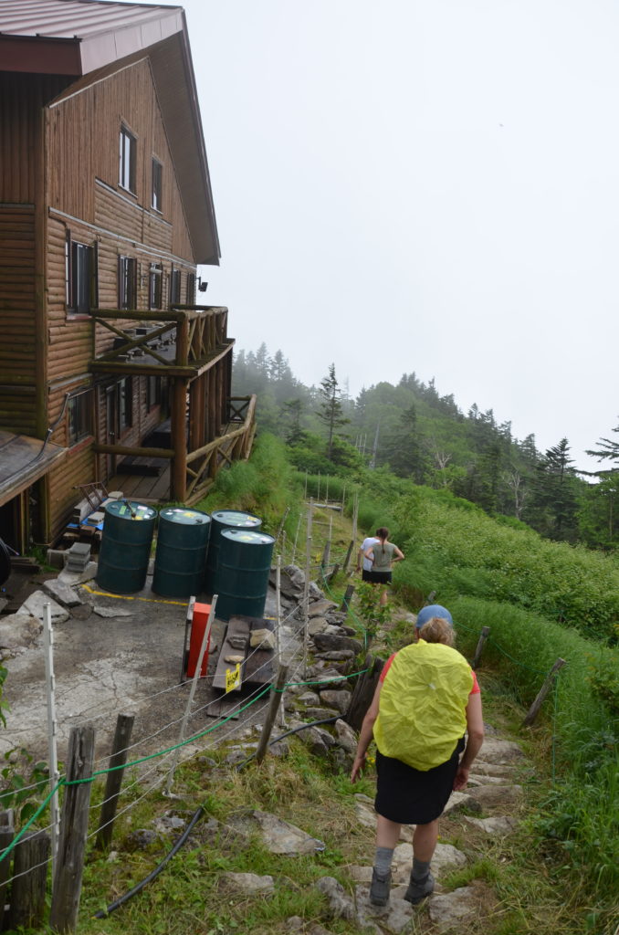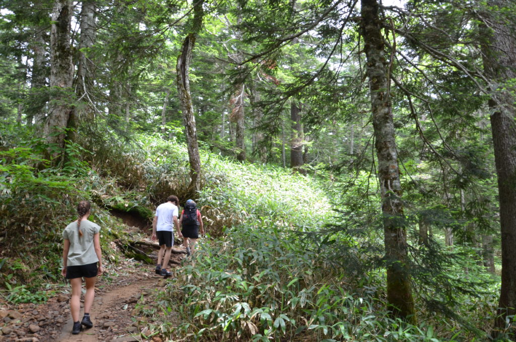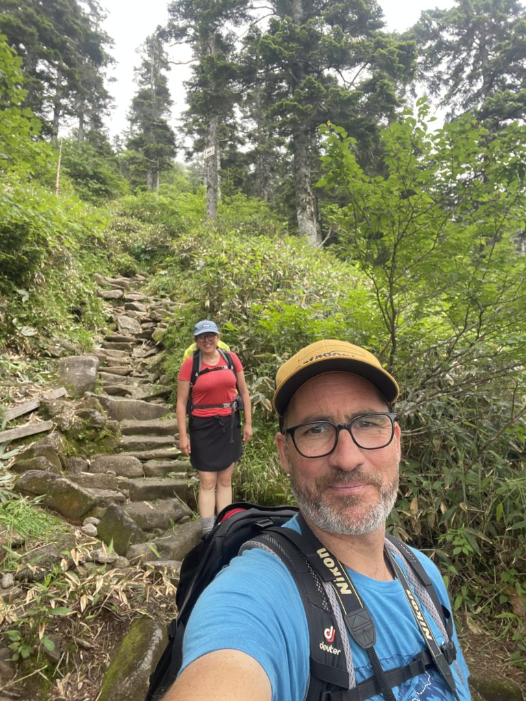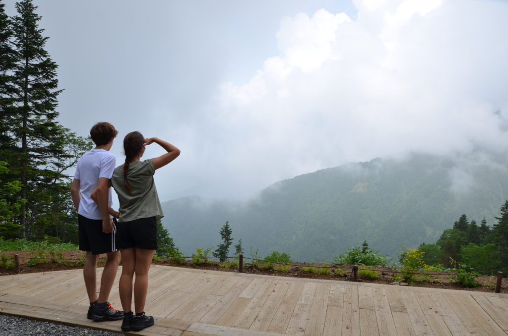 Jour 10 | Hida <> Shinidaka : adeptes de rando alpine, nous avions envie de goûter à la montagne japonaise. Il faut cependant composer avec la chaleur ambiante qui nous dissuade d’effectuer une trop longue ascension. Nous nous rendons au téléphérique Shinhotaka Ropeway qui va nous épargner une montée trop éreintante, et nous propulser directement à 2 156 mètres d’altitude. Nous constatons que l’accès au téléphérique peut se faire également par la station intermédiaire, équipée d’un grand parking à proximité. Nous arrivons à la station supérieure de Nishihotakaguchi où a été aménagé un large deck d’observation mais la vue sur les sommets est partiellement bouchée par des nuages persistants. Nous nous engageons alors sur le sentier balisé qui mène au refuge Nishiho Hut. Nous traversons une épaisse forêt, dense et humide, ce qui est assez surprenant à cette altitude élevée. Nous croisons plusieurs randonneurs japonais, souriants et suréquipés, reconnaissables aux tintements de leurs clochettes pour éloigner les ours… Au bout d’une heure trente d’efforts, nous atteignons le refuge, posé sur un col qui permet de prendre la mesure du massif. Cela donne envie d’en faire plus mais il nous faudrait plusieurs jours pour parcourir les différents sommets. L’averse nous a rattrapé, et nous trouvons refuge dans la hutte autour d’un café et d’un chocolat chaud. Le retour s’effectue par le même sentier, rendu glissant par l’averse récente. La descente en téléphérique nous permet d’admirer le massif enveloppé par d’épais nuages.