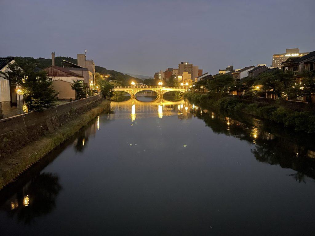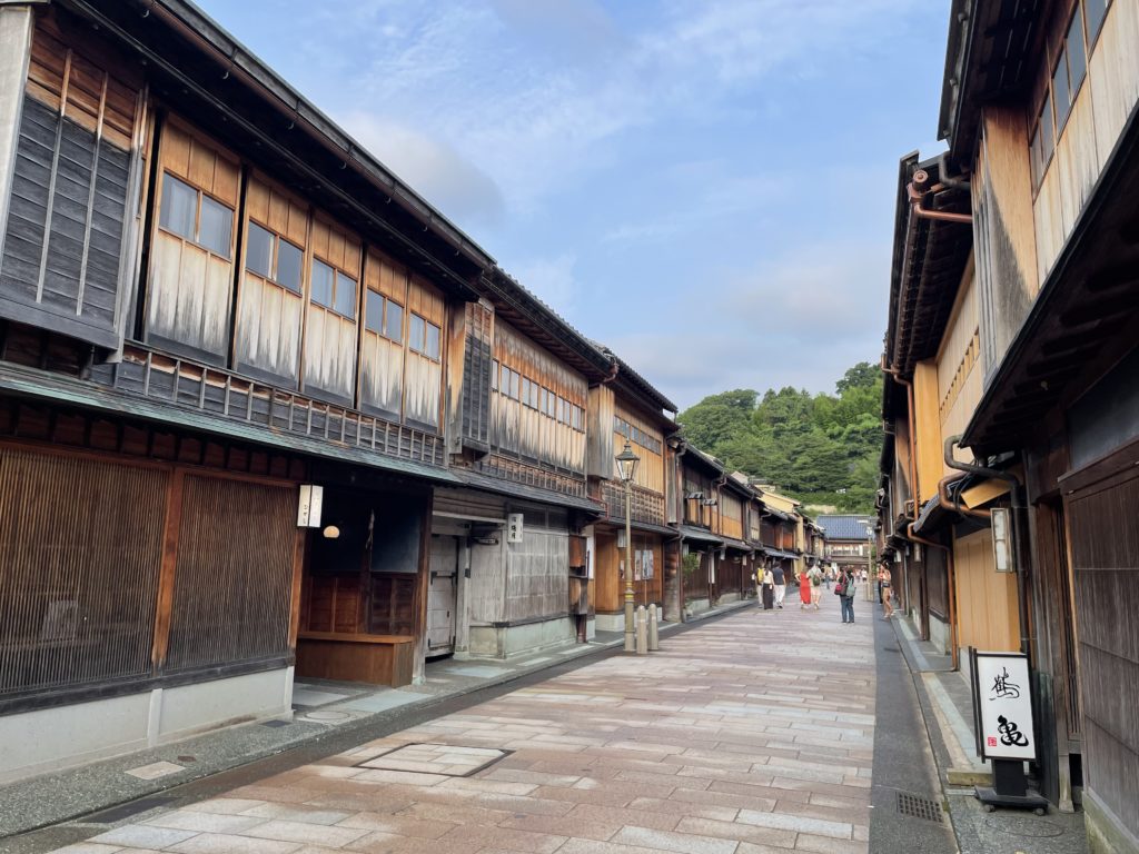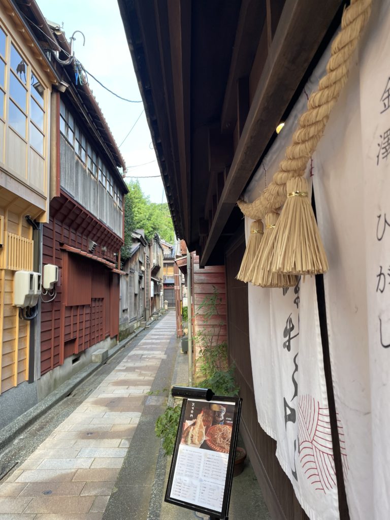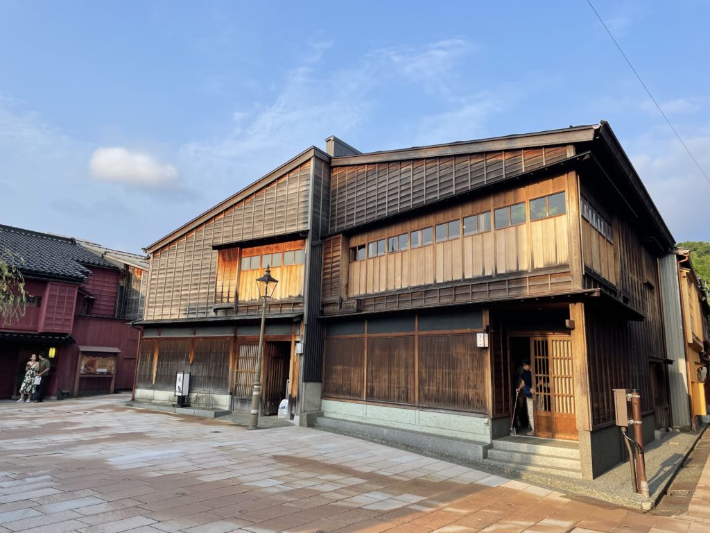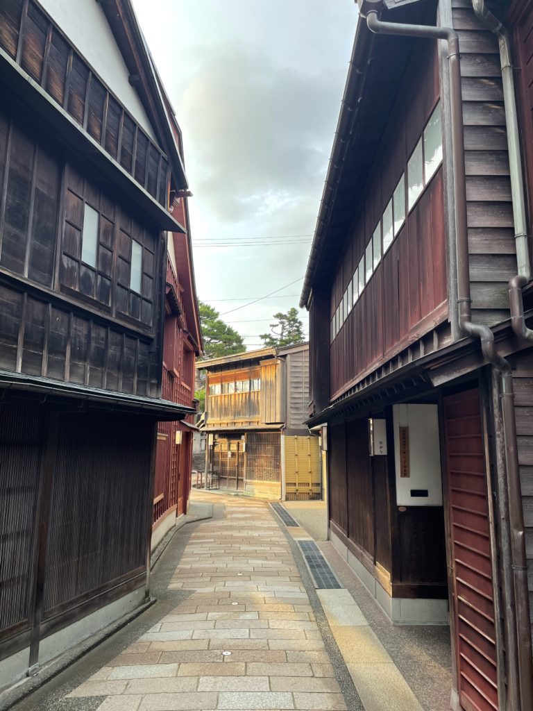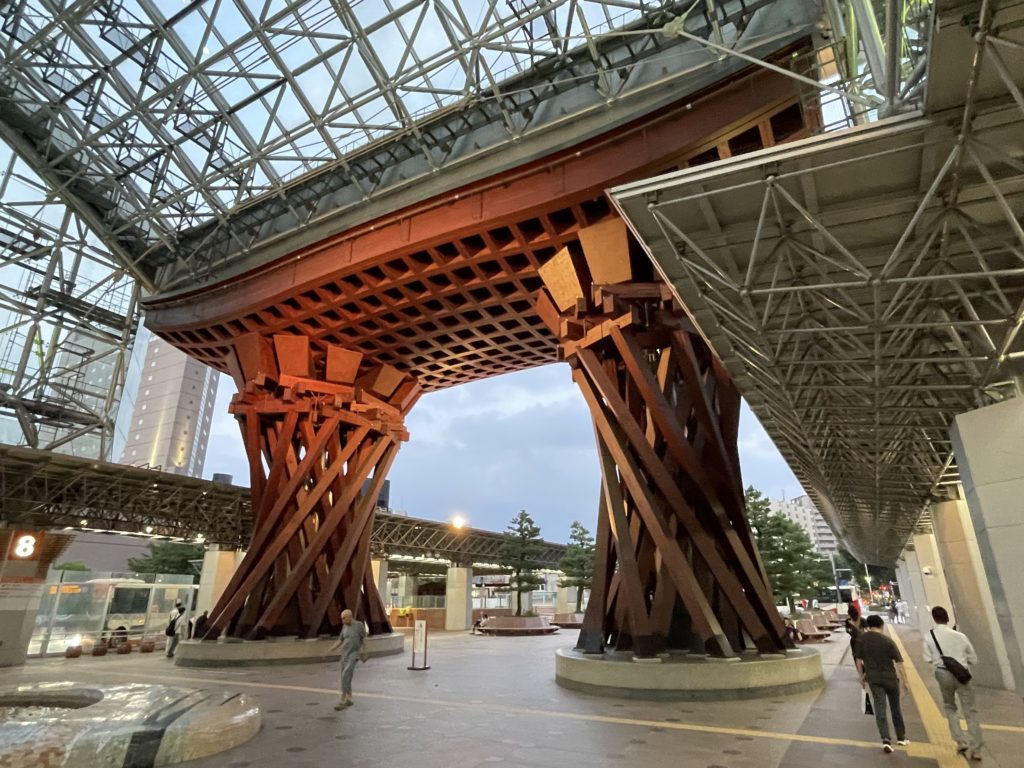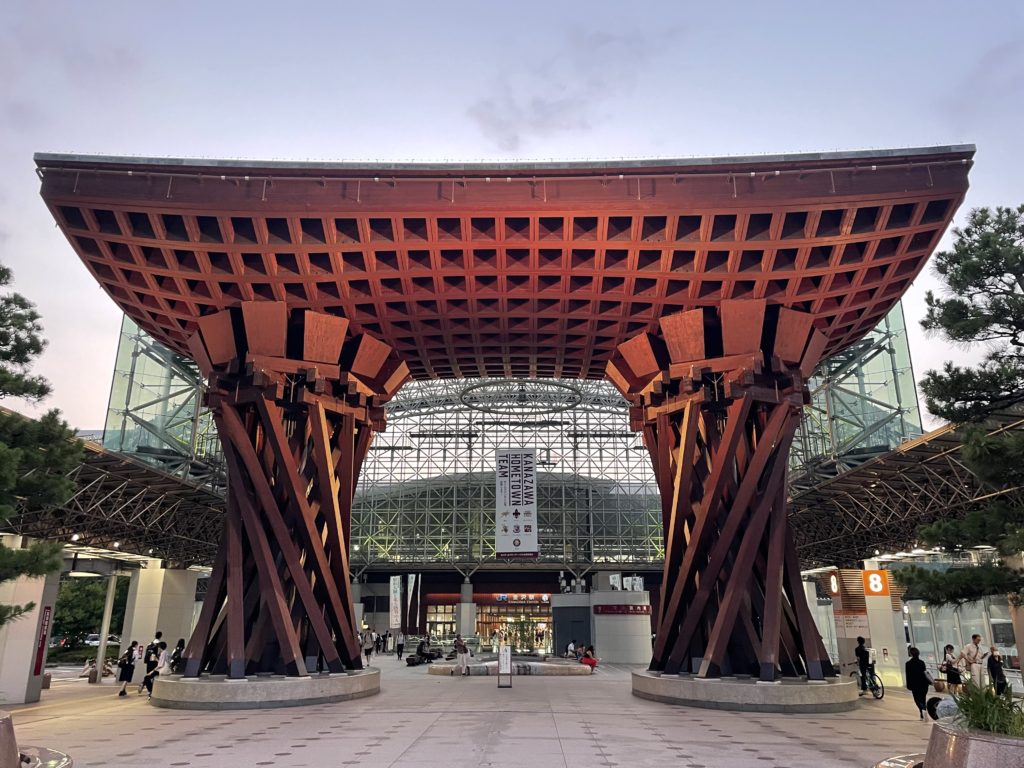 Jour 6 | Tokyo > Kanazawa : ce premier voyage en Shinkansen est une révélation. Ponctuel, rapide, confortable, silencieux, les avantages ne manquent pas ! Les wagons sont larges et spacieux, il y a en masse de place pour les bagages et les jambes. Nous savourons nos bentos achetés sur le quai de la gare de départ en admirant le paysage défiler à toute vitesse. Après trois heures de trajet, nous débarquons dans l’imposante gare de Kanazawa et sautons dans un taxi pour nous rendre à l’hôtel KUMU. Une fois déposées nos valises, nous partons à la découverte des quartiers typiques de Kanazawa, dont celui de Higashi Chaya, célèbre pour ses alignements d’anciennes maisons en bois traditionnelles. Il n’y a pas beaucoup de restaurants ouverts en ce dimanche soir. Après quelques recherches, nous trouvons Ebisu Sushi, authentique Isakaya situé en dehors des sentiers battus. Le chef nous installe dans son salon reconverti en salle à manger où nous dinons assis sur des tatamis. Nous savourons alors un menu constitué de sushis, sashimis, bouillon et boules de riz sucrées en dessert. Le chef est jovial, heureux de recevoir des voyageurs, et nous offre bières et chocolat en cadeau de départ. Un accueil mémorable !