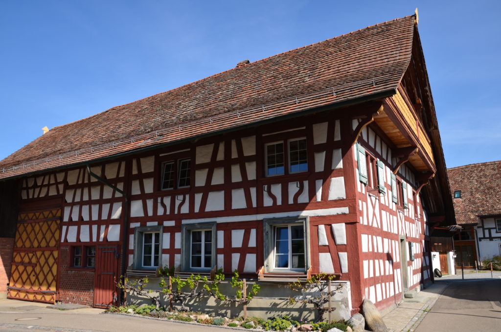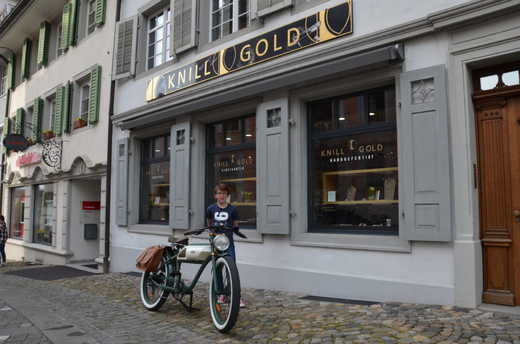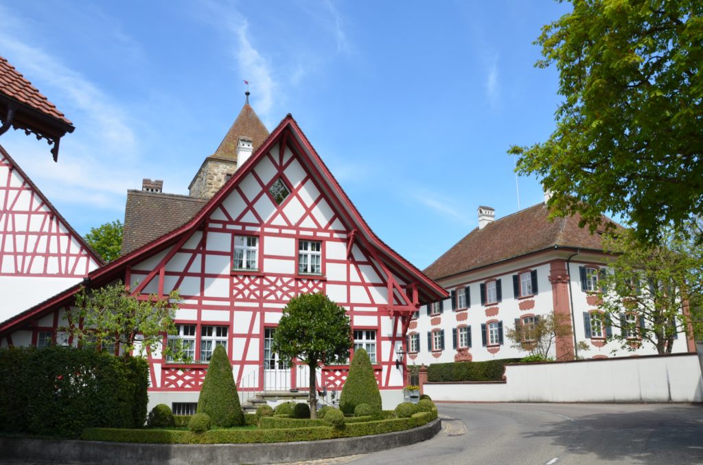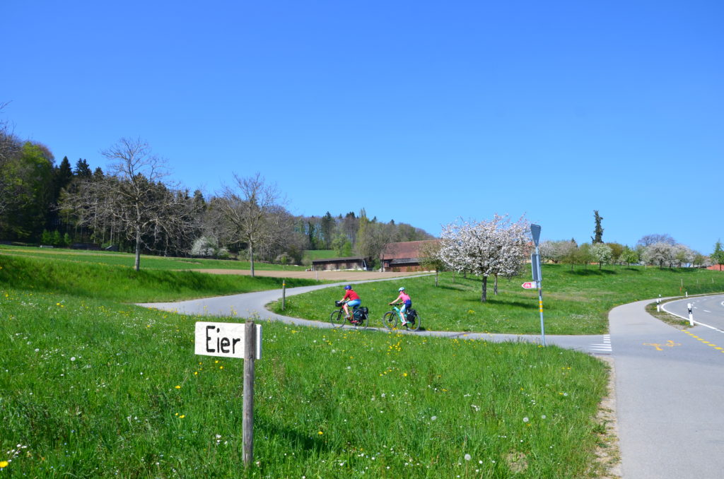 On repart sur la route du Rhin mais sous la grisaille qui nous a rattrapé… On ne pourra pas visiter la ville de Constance, les frontières restant plutôt hermétiques en raison des mesures sanitaires actuelles. Nous traversons alors Kreuzlingen, son Seeburgpark, ses chantiers navals, et roulons à vive allure sur une belle piste (sûrement plus fréquentée durant l’été) entre lac, vergers, voie ferrée et campings. De magnifiques propriétés, que l’on jauge à la taille XXL de leur terrain, occupent les berges. Une fois passé le pittoresque village d’Uttwil, nous déjeunons à Romanshorn avant de rattraper l’itinéraire Route Mittelland qui traverse le centre de la Suisse. Avec ses pommiers fleuris, la Thurgovie a des airs de Normandie ! Le soleil fait son retour, et nous en profitons pour admirer le château médiéval d’Hagenwil, rouge comme une grosse pomme. Puis nous arrivons à la charmante cité historique de Bischofszell, lovée à la confluence des rivières Sitter et Thur qui a donné son nom au canton. La ville est reconnue pour l’énorme papeterie qui siège au creux de cette discrète vallée.
