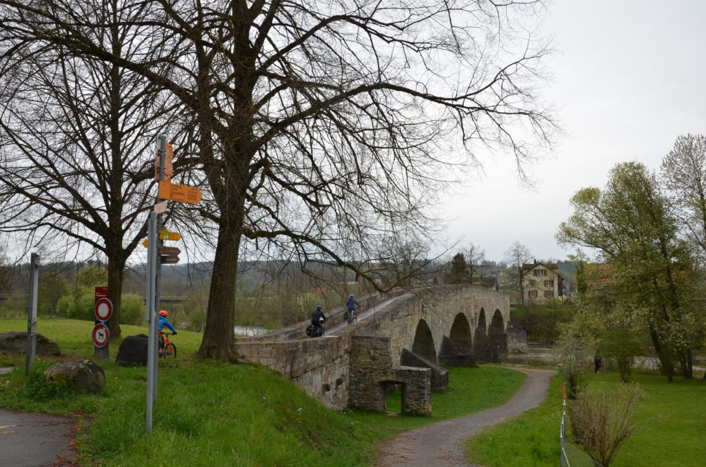 Nous nous rendons en train jusqu’à Bâle, appréciant une fois de plus la facilité de voyager avec des vélos en Suisse (à condition de réserver au préalable une place pour chaque vélo !). La célèbre Route du Rhin à vélo passe juste devant la gare. Nous la suivons en direction de l’Est, et quittons la ville en laissant la banlieue et les zones industrielles bâloises derrière nous. Plusieurs pistes forestières se succèdent avant de rejoindre la charmante ville de Rheinfelden pour une pause-déjeuner. On ne se lasse pas de la diversité des pistes cyclables, routes de campagne et autres chemins champêtres qui constituent ces itinéraires suisses parfaitement balisés. La route offre de beaux points de vue sur les contreforts de la Forêt noire, de l’autre côté du Rhin. Nous arrivons en fin d’après-midi à Laufenburg dont le vieux pont, aujourd’hui piétonnier, fait office de frontière entre l’Allemagne et la Suisse.