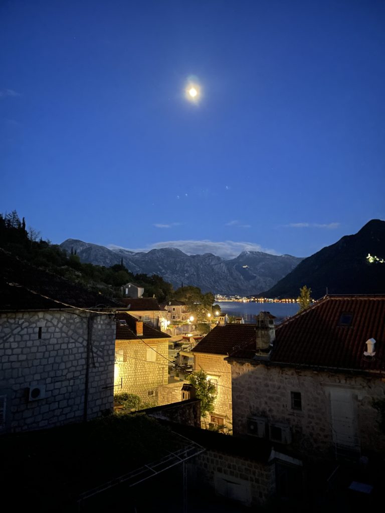 JOUR 1 | Rotterdam > Dubrovnik > Perast : les vols directs à destination du Monténégro et Podgorica, sa petite capitale, sont rares. Mais en étudiant la carte, nous remarquons que Dubrovnik est situé à 20 mn de voiture de la frontière entre la Croatie et le Monténégro. Avec les nombreux vols Transavia qui desservent le sud de la Croatie en 2 heures, c’est le point d’entrée idéal. Nous récupérons notre voiture chez Hertz, bien content de trouver des chaînes dans le coffre car les prévisions météo annoncent de la neige en montagne ! Nous partons en direction de Perast, village niché dans les Bouches de Kotor, à seulement une soixantaine de kilomètres au sud de l’aéroport. Seule difficulté, le passage de la frontière où il nous faudra patienter une heure en raison des contrôles de sortie de l’Union européenne. Nous suivons ensuite une belle route panoramique au bord de l’eau et arrivons à la nuit tombée à Perast. L’accès à l’Hôtel CONTE n’est pas aisé, il faut s’armer de patience car le village s’étend le long d’une unique rue étroite où il est impossible de croiser d’autres véhicules. Il faut se stationner à l’un des parkings situés aux extrémités et prendre une petite navette pour rejoindre l’hôtel avec nos bagages. On n’ose imaginer le chaos en haute saison… Une fois installés dans une belle chambre (#27) située dans une dépendance de l’hôtel, nous rejoignons la terrasse du restaurant CONTE pour dîner les pieds dans l’eau.