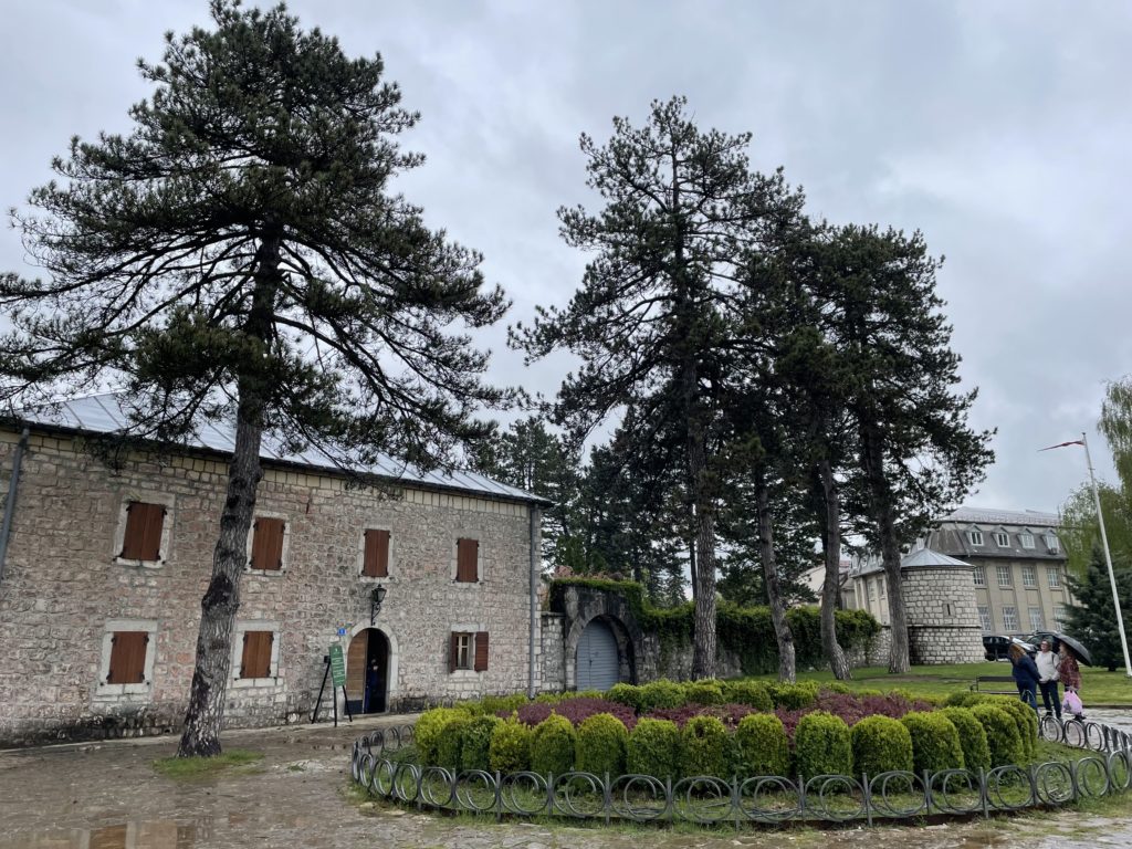 Nous poursuivons vers Cetinje, l’ancienne capitale royale du Monténégro. De cette période glorieuse, la ville a hérité de très belles demeures historiques qui abritaient des consulats, des ambassades, mais aussi le Plavi Dvorac (la maison bleue), l’actuelle résidence officielle du président monténégrin. Nous passons également devant l’impressionnant Musée national du Monténégro et, à l’écart aux pieds des montagnes, le Monastère de Cetinje. Malgré la pluie, la ville a vraiment du charme. Nous déjeunons au Kole, une petite brasserie qui sert d’énormes sandwichs dont nous ne verrons pas la fin !