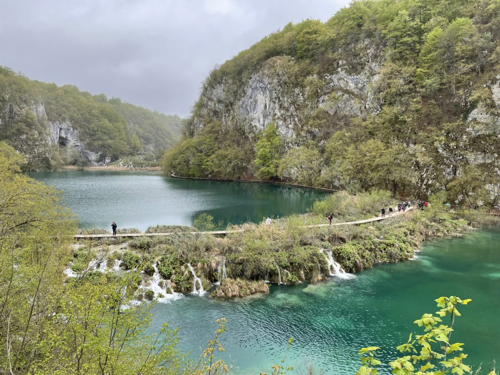 Jour 4 | Plitvice : c’est l’un des lieux les plus convoités de la Croatie, classé au Patrimoine mondial de l’UNESCO. Le Parc national des lacs de Plitvice est une réserve forestière de 295 km² situé à faible altitude dans les Alpes dinariques, au centre du pays. Il est reconnu pour sa succession de 16 lacs en terrasse, liés par 92 magnifiques chutes d’eau qui s’étirent dans un canyon calcaire, niché au cœur d’une vaste étendue forestière bien préservée. Pour éviter la cohue, nous partons à pied de notre chambre d’hôtes après y avoir pris un excellent petit-déjeuner et les dernières recommandations du sympathique propriétaire. Nous rejoignons l’entrée principale du parc située à seulement 2 km en traversant village et forêt. Après une courte traversée en bateau électrique, nous suivons un premier itinéraire de 18 km qui fait le tour des 12 lacs supérieurs. Malgré la pluie fine qui nous accompagne, le lieu est féérique et révèle ses incroyables couleurs. Il n’y a pas encore beaucoup de monde sur les sentiers et les passerelles bien aménagés permettent d’accéder au plus près des chutes.