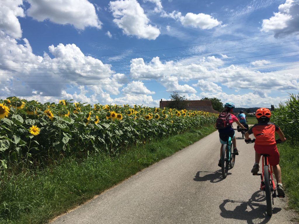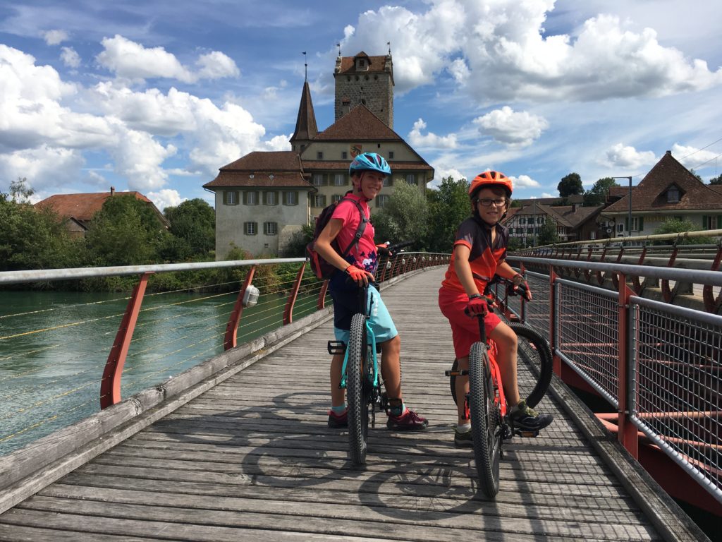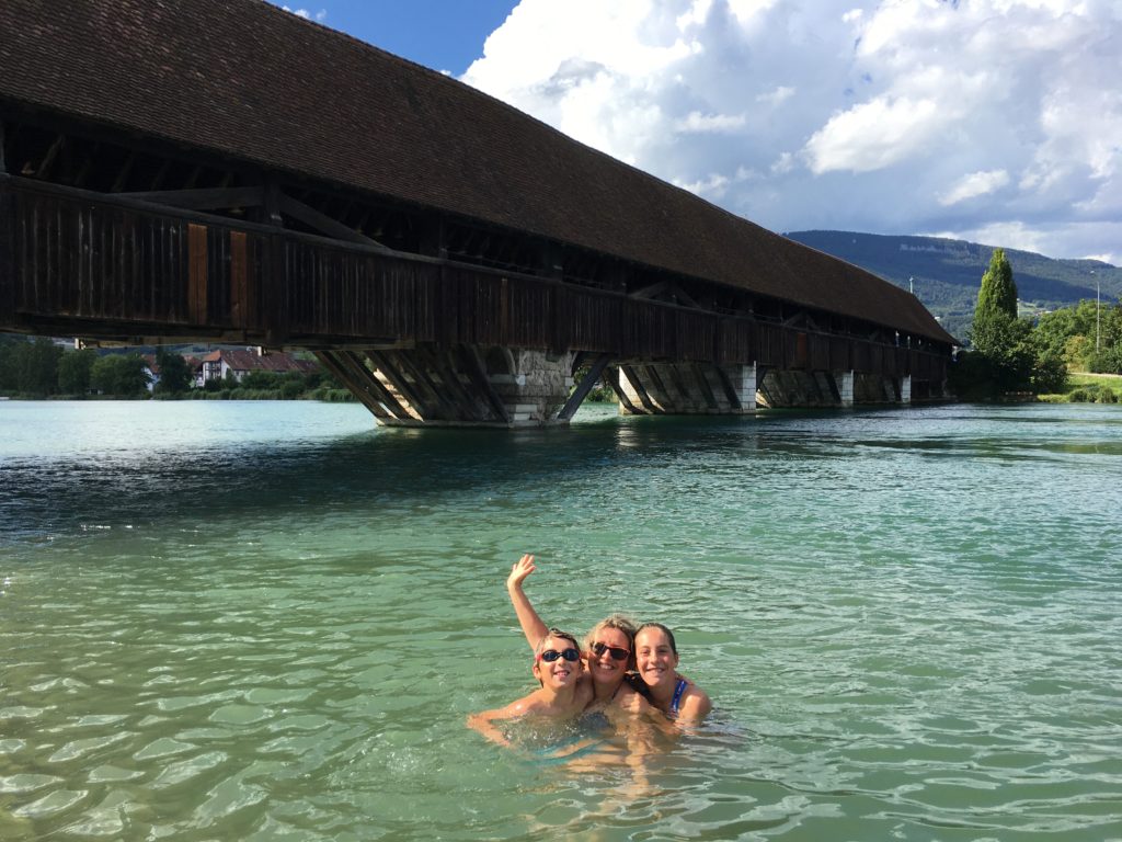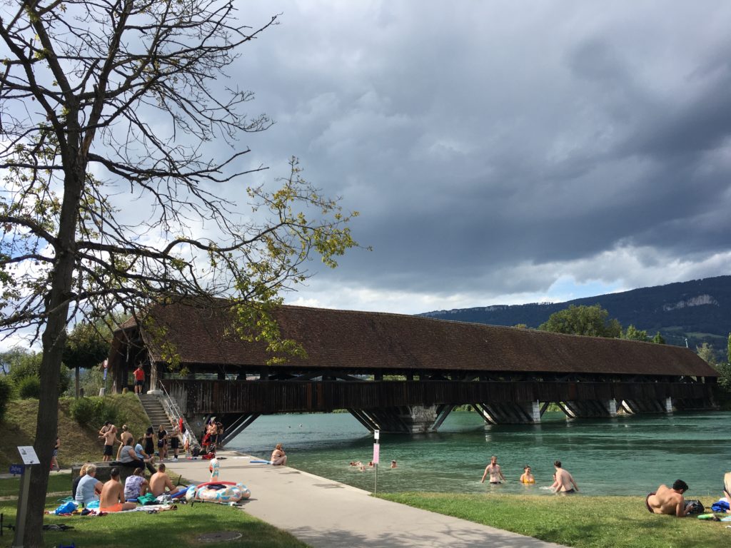 La piste délaisse alors l’Aar pour traverser campagne et forêts avant de la retrouver à Aarwangen et son imposant château. Déjà 80 km au compteur… Avec la chaleur estivale accablante qui nous accompagne depuis le début de notre périple, nous ne résistons pas à une pause baignade à Wangen an der Aare, au pied d’un pont couvert construit en 1552.