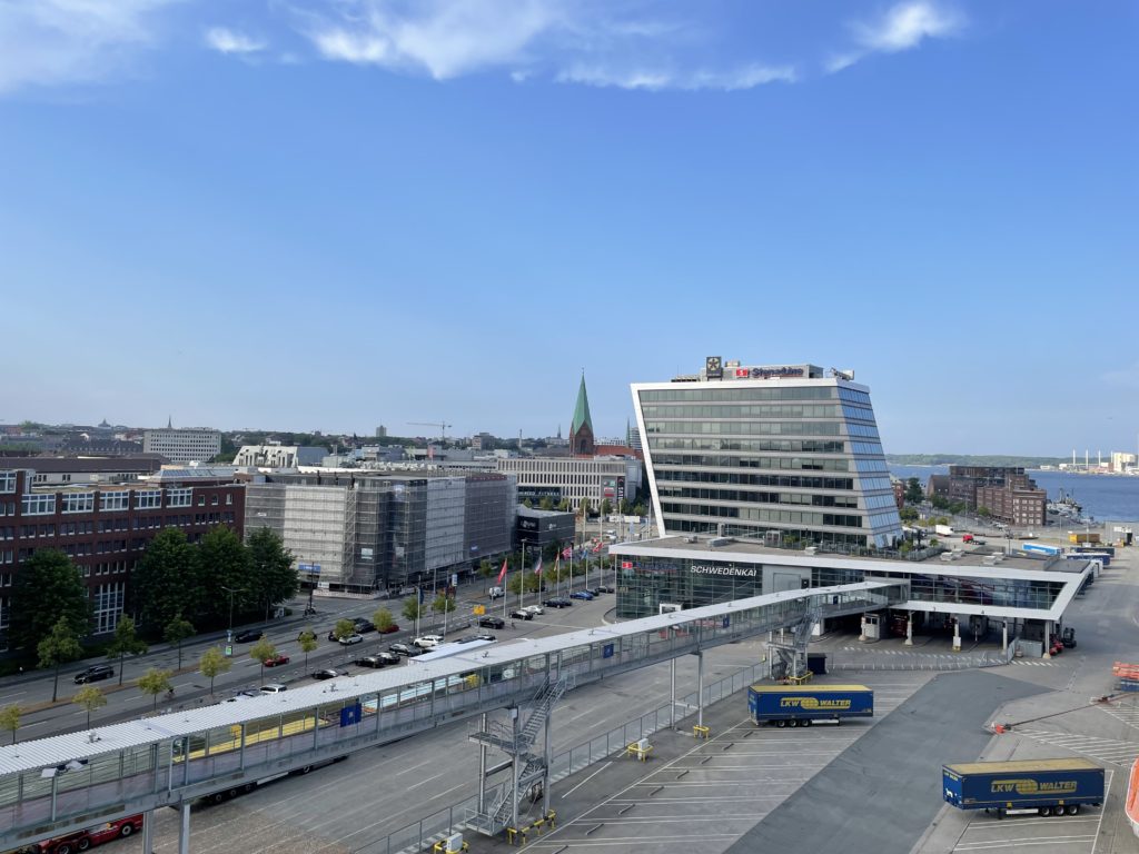 Jour 2 | Hambourg > Kiel : nous quittons Hambourg en milieu d’après-midi pour rejoindre la ville côtière de Kiel à une centaine de kilomètres au nord. C’est une ville nichée au fond d’un bras de mer qui abrite un port important d’où partent de nombreux ferrys à destination du Danemark, de la Norvège et de la Suède. Nous embarquons à bord d’un navire de la compagnie Stenaline avec laquelle nous avons réservé une traversée qui va nous acheminer à Göteborg, 2ème ville de Suède après Stockholm. Une fois notre véhicule stationné au milieu des camping-cars et des camions, nous prenons possession de notre cabine (vue mer !) où nous passerons la nuit puis grimpons sur le pont supérieur pour admirer la sortie du port de notre bateau à la tombée du jour. L’air est frais et iodé, aucun doute, nous partons traverser la Mer du Nord !