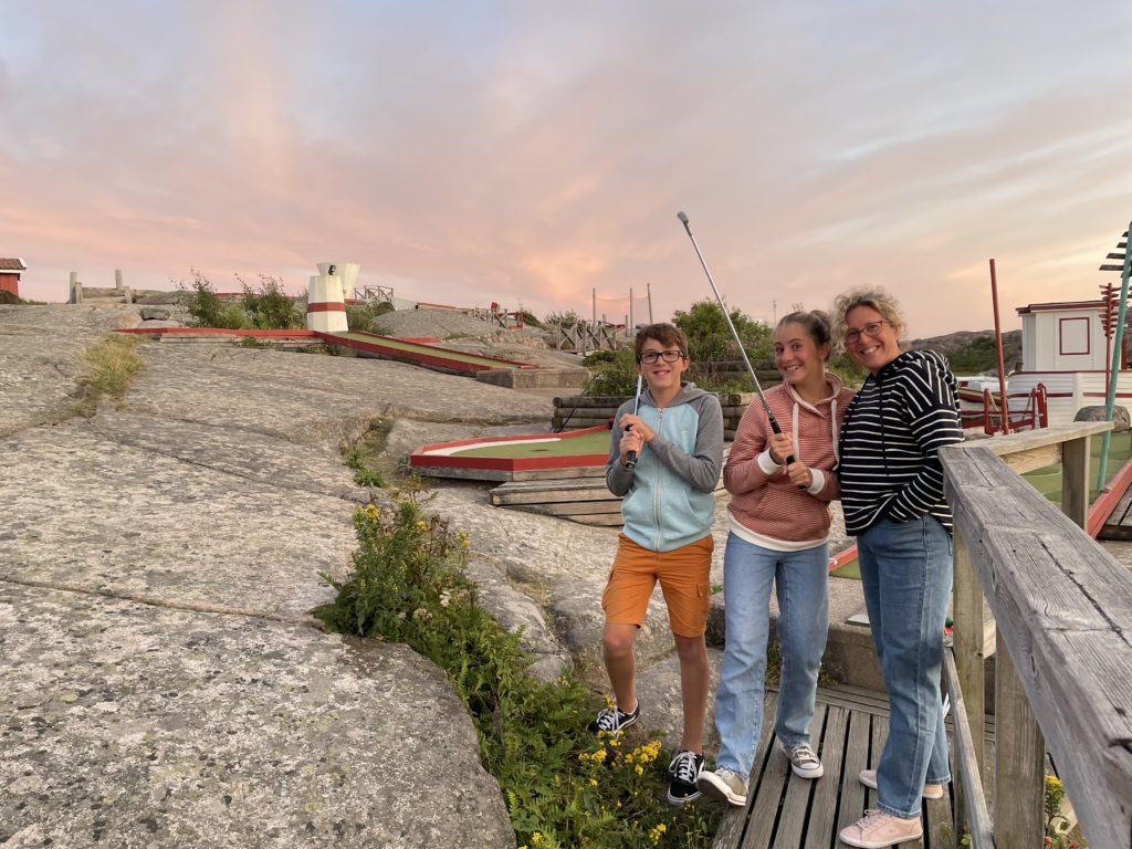 Nous avons réservé un petit bungalow posé au bord de l’eau dans le camping FIRSTCAMP SOLVIK niché au milieu des rochers. Pour ce voyage, nous alternons hôtel, location saisonnière et nuit sous la tente ! Pendant que les enfants font une pause baignade, nous partons faire un ravitaillement à l’épicerie ICA de Smögen afin de profiter de la terrasse de notre petit pied à terre en bord de mer. Nous terminons la soirée par une partie de mini-golf qui nous a bien amusé jusqu’à la tombée de la nuit !