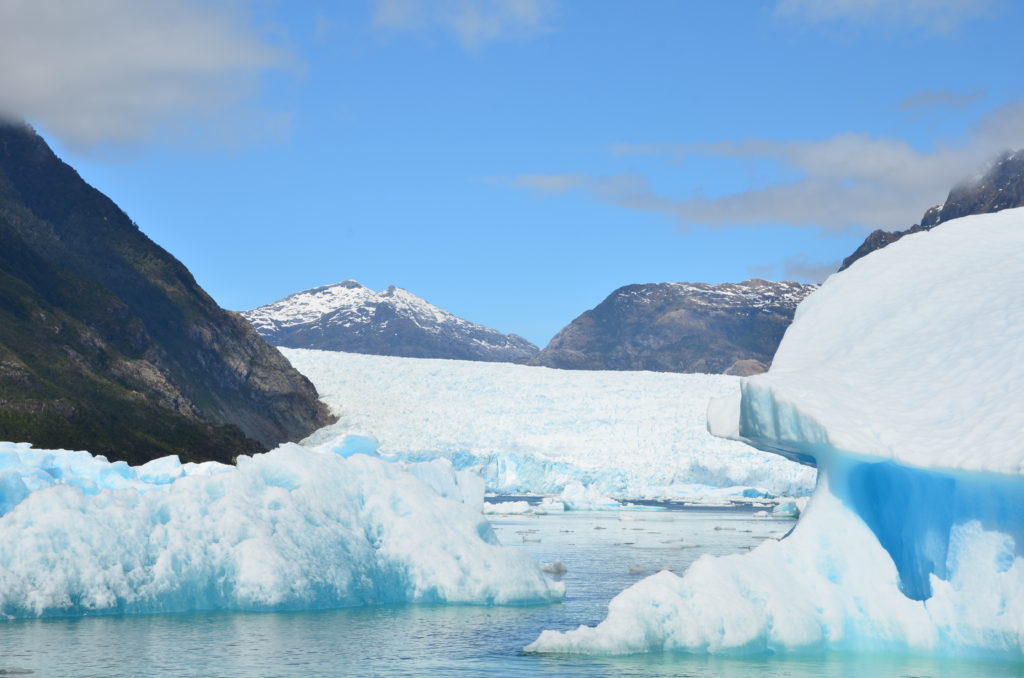 Le rendez-vous est fixé à 7h00 au Puerto Chacabuco pour rejoindre notre embarcation. Il s’agit d’une excursion organisée par un tour-opérateur plutôt haut de gamme, nous prenons donc place à bord du bateau en compagnie de 150 touristes américains… Nous descendons le fjord pendant près de 4 heures avant de voir apparaitre de premiers icebergs dérivés au fil de l’eau. Nous approchons de la Laguna qui se révèle au détour d’un cap. Le spectacle est alors époustouflant. La couleur bleue du glacier est particulièrement exceptionnelle. Des crevasses découpent le glacier en autant de séracs telle une « forêt » de pinacles qui n’attendent que de s’effondrer dans la mer d’un instant à l’autre, formant ainsi les icebergs qui dérivent dans le fjord.