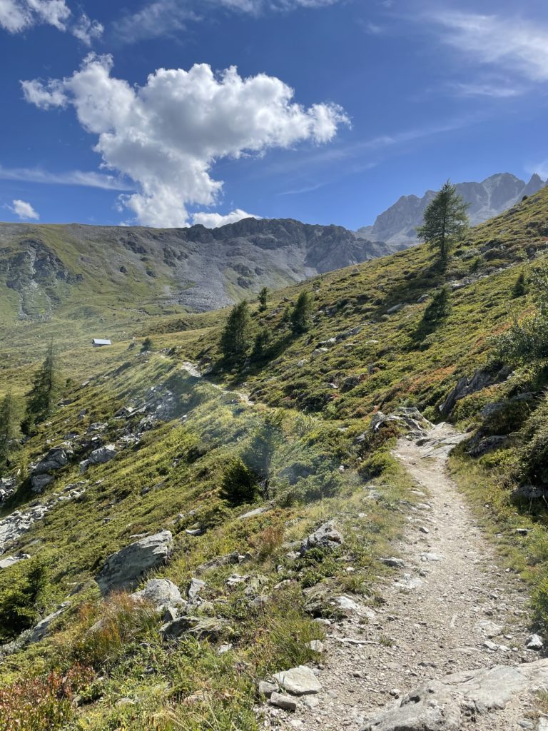 Situé à 2 000 mètres d’altitude, Arolla est un village isolé, niché au fond du Val d’Arolla. Il a été longuement inaccessible, la route datant seulement de 1960. Nous avions déjà eu l’occasion de séjourner à l’hôtel historique Grand Hôtel Kurhaus en hiver, pour profiter des quelques pistes de la station. Nous prévoyons aujourd’hui de rejoindre la cabane de montagne des Aiguilles rouges, située à 2 810 mètres. Nous attaquons notre randonnée par une longue montée à travers une forêt de sapins puis rejoignons de verts alpages avant d’atteindre une zone minérale, totalement dépourvue de végétation. Après un pique-nique au bord du torrent du Glacier des Ignes, nous atteignons enfin la cabane, somptueusement posée au pied des Aiguilles rouges. Nous entreprenons ensuite la descente vers le Lac Bleu, un lieu magnifique malheureusement victime de son succès sur les réseaux sociaux, et surfréquenté en été. Nous rejoignons ensuite Arolla par le sentier qui constitue la 26e étape du magnifique itinéraire Chemin des cols alpins. Il nous a semblé particulièrement ardu, composé de montées et de descentes régulières, mais offrant un panorama fantastique sur la vallée. Une boucle sportive de 13 km, somptueuse et variée, cumulant 1 000 m de dénivelé positif.