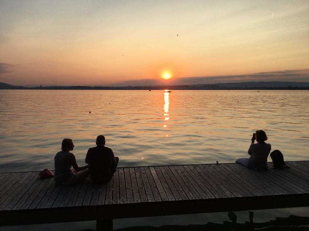 Zoug est une ville tranquille comptant à peine plus de 30 000 habitants. Mais sa situation « les pieds dans l’eau » lui accorde une ambiance estivale animée, surtout lors d’une chaude journée d’été indien. En soirée, nous nous rendons sur la place Landsgemeindeplatz, en bordure du lac, où reposent des pédalos multicolores, réchauffés par le soleil couchant. La terrasse d’un glacier vibre aux sons électro d’un DJ ! Et puis il ne faut pas manquer le coucher de soleil sur le lac, depuis la place Garbiplatz, en s’installant sur l’embarcadère situé tout près des volières. Nous terminons la soirée au Freiruum une ancienne usine (Siemens) reconvertie en espace événementiel, en retrait de la vieille ville. C’est l’un des lieux branchés de la capitale zougoise, regroupant une multitude de restaurants ethniques et des concerts live. Une très belle ambiance pour terminer cette journée autour du Zugersee !